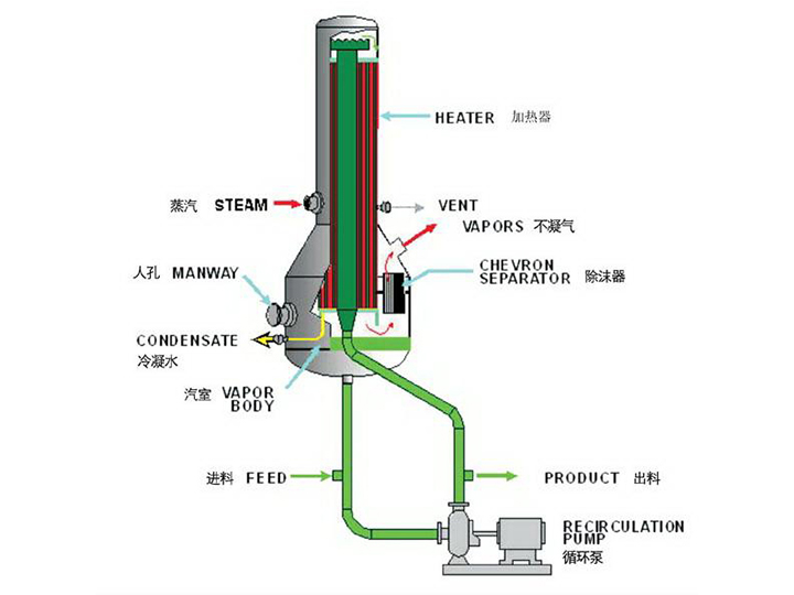 需濃縮的料液由泵送入加熱管頂部,沿著加熱管內壁形成液膜向下流動。在這個過程中,由于管外的加熱,管內液膜開始沸騰并部分蒸發。在列管下部分及其下游的分離器中,剩余的液體和蒸汽得以分離。